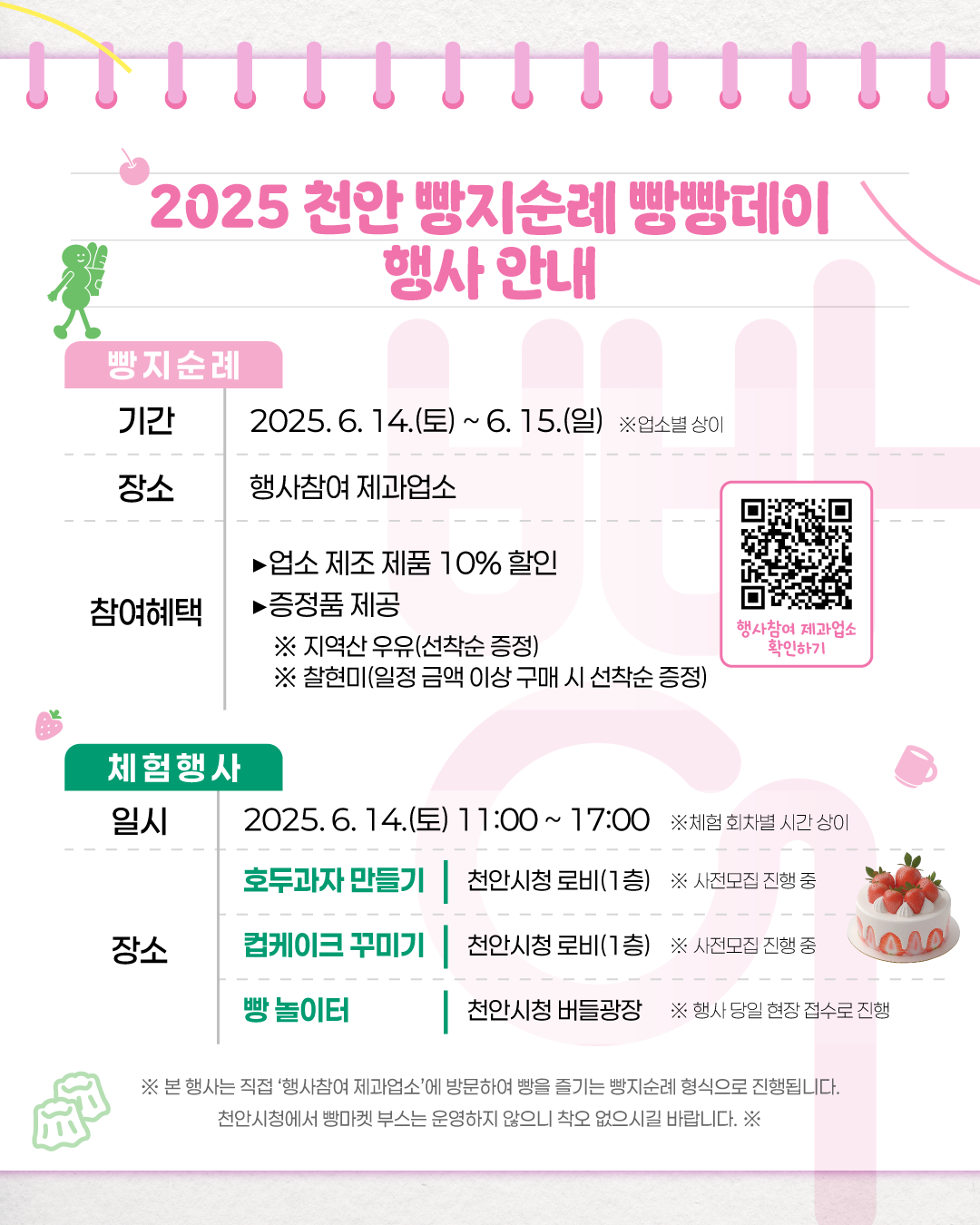 ※ 모든 체험과 혜택은 ‘참여 제과업소’ 방문 시 적용됩니다. 천안시청 내에서는 판매 부스가 운영되지 않으니 착오 없으시길 바랍니다.